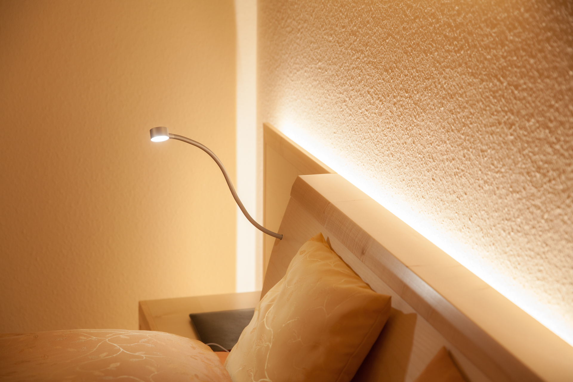 Wie bei der Regulierung des Wach- und Schlafrhythmus‘ spielt auch im Schlafzimmer das Licht eine entscheidende Rolle. Ob blendfreies Munter-mach-Licht aus der verdeckt eingelassenen LED-Leiste am Kopfteil, konzentriertes Licht für den Einbauschrank oder die dimm- und schwenkbaren LED-Leseleuchten – für das passende Licht ist stets gesorgt. Und dank Fernbedienung für die Einbauleuchten können Sie ganz bequem vom Bett aus die gewünschte Beleuchtung wählen.